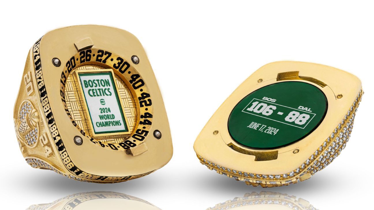 Los Celtics de Boston muestran en detalle sus impresionantes anillos de campeones.